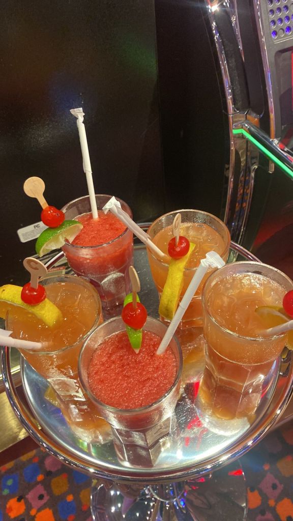Una vez terminada las cenas, en donde cada tanto aparece un show, o camareros bailando, lo siguiente es ir a alguna de las fiestas a bailar y a tomar unos tragos, también esta la opción del casino, que a nosotros nos gusta bastante con el gran cuidado de que es en dólares y que la apuesta mínima es u$s0,5 y por si tenían la curiosidad, nosotros al final del crucero terminamos ganando 150 dólares, que gastamos así como entraron en chocolates y una cartera super linda. Otro dato de color es que por jugar en el casino nos regalaron aproximadamente 10 tragos.