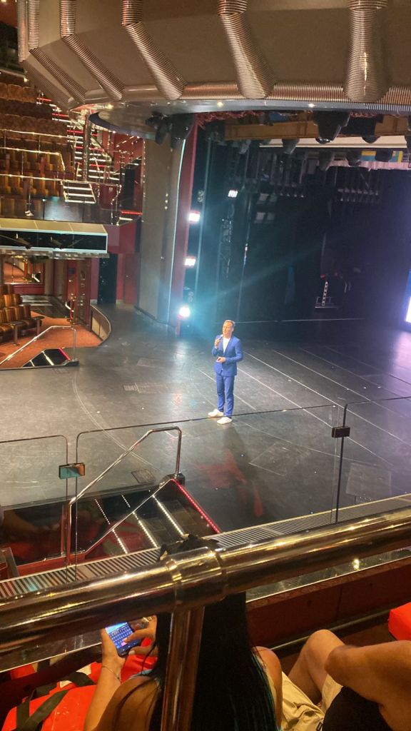 Después de este primer almuerzo, tuvimos la charla explicativa del crucero, que se da en el teatro que se encuentra en el piso N°3, N°4 y N°5 del barco (si, el teatro tiene tres pisos!), y este es el momento donde todas las dudas sobre los manejos y demás quedan resueltas: como pagar, como es el tema de las bajadas, y como funcionan las cenas. También fue el momento de hacer el simulacro, que fue medio un lío porque nadie entendía muy bien que hacer, pero una vez hecho ya estuvimos liberados para tomar sol, ir a la pileta y merendar hasta las 18 que salía el barco de Buenos Aires.