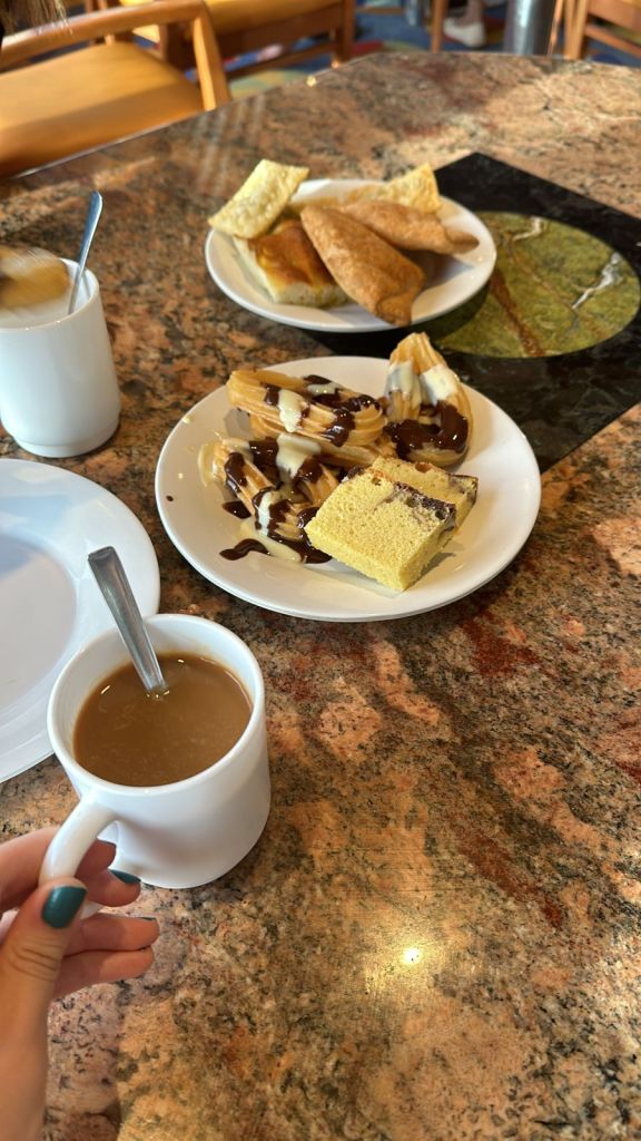 En este primer día, y primer merienda, si aprendimos algo que fue importante para el resto del crucero: En los horarios de Desayuno y Merienda el Buffet es un CAOS. Particularmente toda la gente se amontona en el horario de 18 a 19, fundamental ir a las 17, sentarse, armarse un buen café y cargar la bandeja con todas las cosas que quieras comer y que estén disponibles (tortas, chipá, empanaditas de queso, panes, mermeladas, frutas, etc). Si quizá vimos muchas quejas e impaciencia de parte de algunas personas, hay que entender que 3000 personas en un barco hace que si todos quieren hacer todo a la misma hora se complica. El primer día, como todos hacen todo al mismo tiempo, se ve agravada esta situación, en la medida que fueron pasando los días se organizo un poco mejor, pero en los horarios pico tanto como para desayuno, almuerzo y merienda siempre va a haber fila (nunca más de 15 minutos igual). Decimos esto porque hay gente que piensa que es un hotel 5 estrellas donde uno va y le sirven prácticamente la comida en la boca mientras lo abanican y no es taaan así.